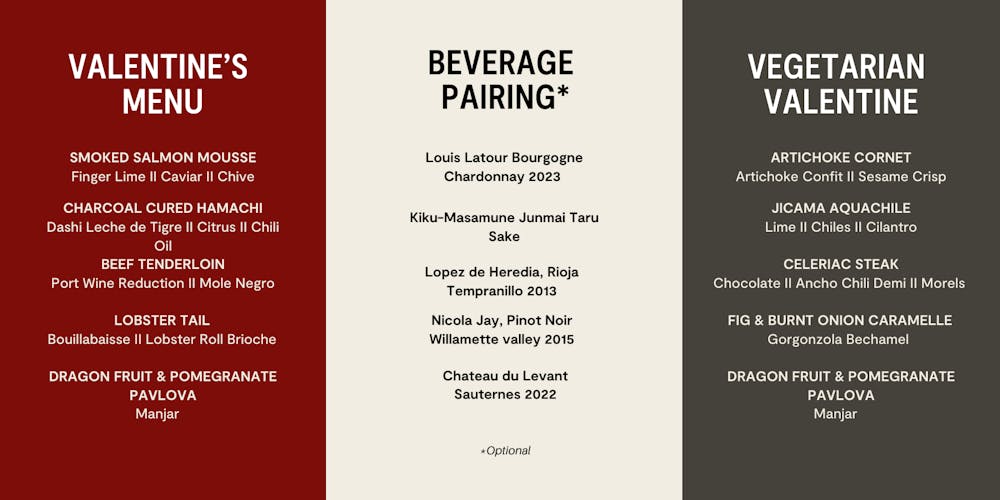 Love is on the menu! Join us this Valentine’s Day for thoughtfully crafted dinner options featuring seasonal flavors, indulgent courses, and just enough sweetness to end the night right. This year we are offering two prix fixe options, including an entirely vegetarian menu. Simply make a reservation online and leave a note for your preferred menu!