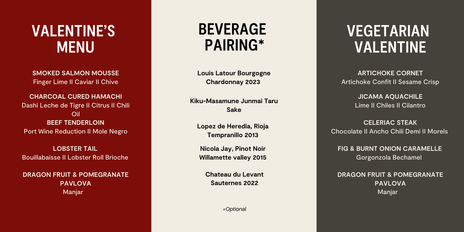 Love is on the menu! Join us this Valentine’s Day for thoughtfully crafted dinner options featuring seasonal flavors, indulgent courses, and just enough sweetness to end the night right. This year we are offering two prix fixe options, including an entirely vegetarian menu. Simply make a reservation online and leave a note for your preferred menu!